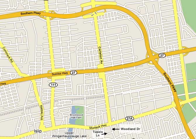 - Turn right onto Carleton Ave. Continue for about ¾ mile. Cross over Main St. (Montauk Hwy or Rt. 27A). There's a 7-Eleven on the left corner. Carleton Ave. becomes Woodland Dr.